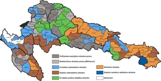 ![]() Results of the election in each of the electoral districts in 8 counties of the Kingdom of Croatia-Slavonia: the party with the plurality of votes in each district. Christian-Social Party of Rights Starčević's Party of Rights People's Party Croatian Independent Party Serb Independent Party Croatian Peoples' Peasant Party Serb People's Radical Party Independent |