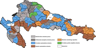 ![]() Results of the election in each of the electoral districts in 8 counties of the Kingdom of Croatia-Slavonia: the party with the plurality of votes in each district. Starčević's Party of Rights Christian-Social Party of Rights Croatian Independent Party Serb Independent Party Unionists Croatian Peoples' Peasant Party Independent |
