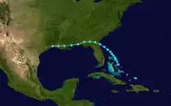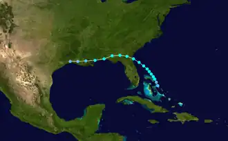 The system drifted northwest while gradually intensifying, and was situated south of the Georgia coast late on September 16. While most tropical systems in the vicinity tend to continue northward along the Eastern Seaboard, the cyclone curved westward and moved ashore near the Florida–Georgia state border after achieving a peak intensity with maximum sustained winds of 70 mph (110 km/h).[2][6] It progressed inland over southern Georgia as it quickly weakened, but its intensity leveled off after around 18:00 UTC on September 17. The storm skirted the northern Gulf of Mexico as it swerved slightly south of due west, weakening to a tropical depression over southeastern Louisiana.[2] By early September 19, the depression had further deteriorated into an open trough—a poorly defined, elongated area of low pressure.[1]