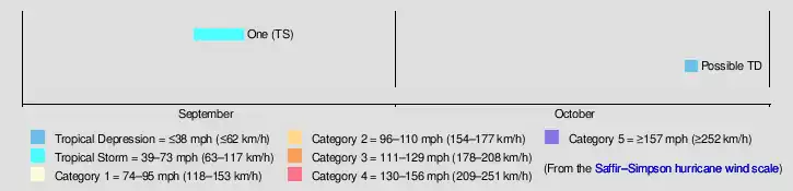 With only one official tropical cyclone, the 1914 season was the least active tropical cyclone season on record. It is one of only two Atlantic seasons without a storm of hurricane intensity (winds of 75 mph (121 km/h) or stronger),[1] the other being the 1907 season.[2] The sole tropical storm's formation on September 14 represents the latest start to a hurricane season since official records began in 1851.[3]