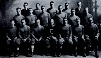 Colby started out its Maine Intercollegiate Athletic Association schedule by defeating a weak Bowdoin team, 48 to 0.[12] The following week Colby faced the Maine, which had won the conference title the past three seasons. As Maine had defeated both Bowdoin and Bates already, the winner of this game would win the state championship. Colby scored its first touchdown on a twenty-five yard pass from Ginger Fraser to Edward Cawley. Defensively, Colby's strong line, led by Walter Dacey, was able to stop the Maine offense throughout the game. Dalcey helped set up Colby's second touchdown by recovering a fumble on Colby's 17 yard line. Colby also benefited from poor play by Maine's quarterback, George H. Bernheisel, who was benched in the second half, as well as in injury to the team's fullback. On November 2, the Lewiston Evening Journal ran the headline "Colby's Football Team Was Plainly Superior: Waterville Eleven Showed Itself Saturday to Be No One-Man Aggregation" (referring to claims that the team only had one star player, Ginger Fraser). The article described Colby's play as "brilliantly fierce" and "the most brilliant exposition of football...ever seen in this city". It also lauded Colby as coming "near possessing one of the best football teams in the history of Maine intercollegiate sport, balanced and strong, versed in every department of the game, cunning in every move."[13] Colby finished out its in-state series against Bates. Fraser scored Colby's first two touchdowns before exiting, which allowed Jack "Smacker" Lowney to have one of the best games of his career, as he scored four touchdowns to lead the team to a 61 to 0 victory.[1]