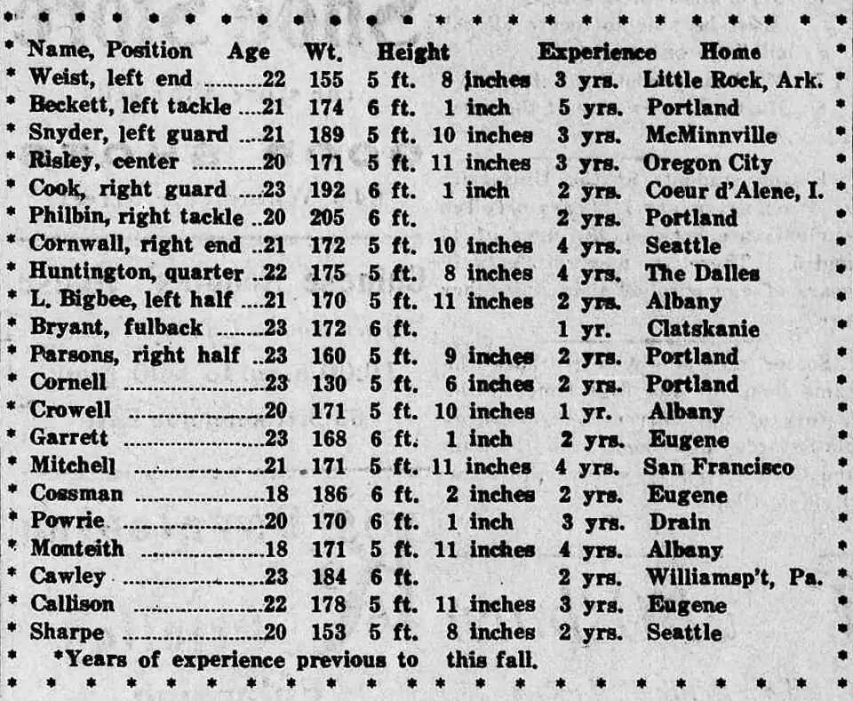 - ^ "Men confident, coach alarmed". Eugene Daily Guard. (Oregon). October 16, 1914. p. 1.