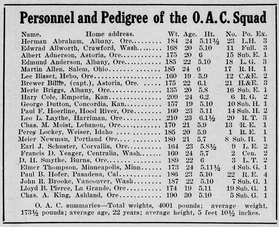 Oregon Agricultural's upset victory over Michigan Agricultural on October 30 was notable because the previous week Michigan Agricultural shut out the unbeaten Michigan Wolverines in Ann Arbor, Michigan. The college played home games at Bell Field in Corvallis, Oregon. Brewer Billie was the team captain.