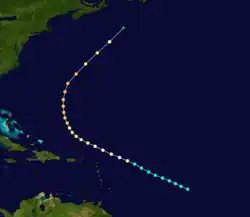 A tropical wave became a tropical depression on September 13 about 450 mi (725 km) northeast of Antigua and Barbuda.[4] The depression moved just north of due west and intensified into a tropical storm early the next day. On September 15, the cyclone turned north-northeastward and intensified into a hurricane early on September 18, shortly after curving northeastward.[2] The hurricane peaked with maximum sustained winds peaked at 85 mph (137 km/h) and a minimum barometric pressure of 1,000 mbar (30 inHg), both estimates based on ship observations.[4] Late on September 20, the cyclone turned eastward and weakened to a tropical storm. The system transitioned into an extratropical cyclone several hours later about 340 mi (545 km) west-southwest of the northwesternmost islands of the Azores. The extratropical remnants dissipated shortly thereafter.[2]