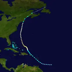 On September 17, the eleventh tropical storm was first detected about 950 mi (1,530 km) east of Barbados. It headed west-northward, strengthening into a hurricane on September 19, before passing well north of the Lesser Antilles. The storm became a Category 3 hurricane early on September 22,[2] and shortly thereafter peaked with maximum sustained winds of 120 mph (195 km/h) and a minimum barometric pressure of 975 mbar (28.8 inHg), based on data from ships and historical weather maps.[4] It turned northeastward and passed by Bermuda on September 24. The storm then weakened significantly and transitioned into an extratropical cyclone on the same day approximately 200 mi (320 km) southeast of Sable Island.[2] Another extratropical cyclone soon absorbed the remnants of this storm.[4]