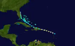 A strong tropical storm was first observed just east of Guadeloupe early on August 21. The cyclone moved west-northwestward, striking or passing near the island and intensifying into a hurricane. Early the next day, the system strengthened into a Category 2 hurricane and peaked with maximum sustained winds of 110 mph (180 km/h),[2] based on a barometric pressure observation of 980 mbar (29 inHg) in San Juan, Puerto.[4] Shortly thereafter,[2] the small diameter hurricane struck Puerto Rico and crossed the island from Naguabo to Aguada.[49] Late on August 22, the hurricane made landfall near Punta Cana, Dominican Republic, with winds of 75 mph (121 km/h). The cyclone quickly weakened to a tropical storm early the next day, several hours before re-emerging into the Atlantic near Port-de-Paix, Haiti. Continuing northwestward, the storm passed just west of the Bahamian islands, before making landfall near Cutler Bay, Florida, with winds of 45 mph (72 km/h) around 08:00 UTC on August 25. The cyclone turned northward over Florida and weakened to a tropical depression early on the following day, shortly before dissipating just offshore New Smyrna Beach.[2]