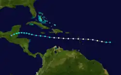 On August 27 at 12:00 UTC, a tropical storm was observed about 800 mi (1,285 km) east of Barbados. It strengthened into a hurricane about 12 hours later. The storm attained its peak intensity around the time it struck Dominica with maximum sustained winds of 80 mph (130 km/h) and a minimum barometric pressure of 986 mbar (29.1 inHg) early on August 28,[2] with the former being based on the latter, which was observed at Roseau.[4] This fast-moving hurricane tracked westward through the Caribbean and weakened to a tropical storm on August 30 while south of Haiti's Tiburon Peninsula. The cyclone weakened to winds of 45 mph (72 km/h) by the following day, but re-strengthened somewhat prior to its landfall in northern Belize with winds of 60 mph (97 km/h) on September 1. The storm moved west-southwestward into Guatemala and weakened, falling to tropical depression intensity on September 2 and dissipating shortly thereafter.[2]