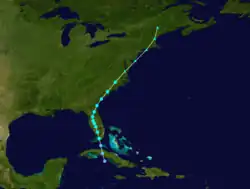 On May 13, a tropical depression formed about 60 mi (95 km) south of Trinidad, Cuba. It quickly crossed the island and moved over the Straits of Florida. The cyclone strengthened to a minimal tropical storm on May 14 and soon made landfall near Key Vaca, Florida, with winds of 40 mph (65 km/h). Around 06:00 UTC the storm struck the Florida mainland near Cape Sable and initially moved north-northwestward across the state.[2] Based on observations from Tampa late on May 14, the storm's minimum barometric pressure is estimated at 1,004 mbar (29.6 inHg).[4] The cyclone turned northeastward on May 15. It transitioned to an extratropical cyclone over eastern Virginia on the following day. The remnants briefly re-emerged over the Atlantic, before striking New England and dissipating over Maine on May 17.[2] Initially, the cyclone was not included in the Atlantic hurricane database.[4]