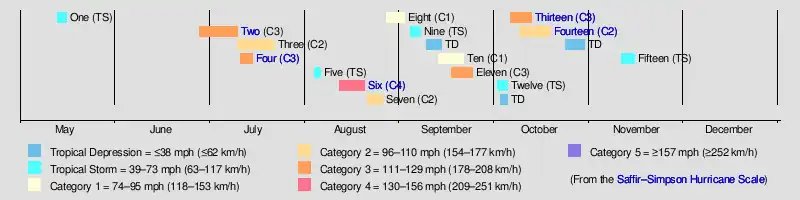 Tropical cyclogenesis began on May 13, when a tropical depression formed south of Cuba. The storm struck Cuba and Florida before becoming extratropical over Virginia on May 16. Following an almost month and a half lull in activity, the season's second tropical cyclone developed over the southwestern Caribbean Sea on June 28. The third and fourth cyclones, both reaching hurricane intensity, formed in July. The month of August featured four tropical cyclones, including a tropical storm and three hurricanes. One of those, the season's sixth tropical cyclone, became the most intensity system in the Atlantic basin in 1916 and peaked at Category 4 intensity on the modern-day Saffir–Simpson scale with maximum sustained winds of 130 mph (210 km/h).[2] In terms of barometric pressure, the storm was also the most intense to strike the United States since the 1886 Indianola hurricane.[3] Four tropical systems also developed in September, with one tropical depression,[4] one tropical storm, and two hurricanes.[2] October was the most active month of the season, featuring two tropical depressions,[4] one tropical storm, and two hurricanes. In November, a tropical storm developed on November 11 and transitioned into an extratropical cyclone by November 15, ending season activity.[2]