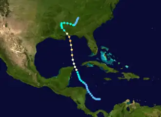 The second tropical cyclone of the 1916 season formed as a tropical depression in the southwestern Caribbean Sea around 12:00 UTC on June 28. The depression drifted northwestward, and on June 30 it passed just east of Cabo Gracias a Dios.[3] The system swept across the Swan Islands beginning on the morning of July 1, punctuating two days of unsettled weather there. Operationally, this was the first confirmation of the storm's existence.[4] Around 00:00 UTC on July 2, the depression intensified into a tropical storm while centered just west of the Swan Islands.[3] On the afternoon of July 3, USCGC Itasca encountered easterly gale-force winds while located 25 mi (40 km) south of Cape San Antonio, Cuba; late that night, USS Monterey also endured gales generally from the east while situated roughly 90 mi (140 km) northwest of the cape. As a result, it was determined that the system,[4] after intensifying into a hurricane at 18:00 UTC on July 3,[3] passed west of the ships through the Yucatán Channel and into the Gulf of Mexico. No further radio reports were received from ships near the hurricane, apparently because of effective shipping advisories. Upon entering the Gulf of Mexico, the hurricane began to strengthen more quickly and accelerated toward the north-northwest.[4]