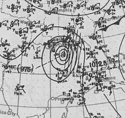 As the storm approached the central Gulf Coast of the United States, it possessed maximum sustained winds of 120 mph (195 km/h), making it a Category 3 major hurricane on the modern-day Saffir–Simpson scale.[3] This is officially listed as its peak intensity, but because observations of the storm over the open Gulf of Mexico were sparse, it may have previously been stronger. At 20:00 UTC on July 5, the hurricane made landfall near Pascagoula, Mississippi, while at its strongest known intensity.[5] At the time, this represented the earliest recorded U.S. major hurricane landfall in any season.[6] While the eye passed overhead, Pascagoula experienced a 20-minute lull in the storm's force.[7] At landfall, the radius of maximum wind was likely 17 to 23 mi (27 to 37 km) and minimum central barometric pressure was estimated at 950 hPa (28.05 inHg), the latter of which was used to derive the storm's peak winds.[5]