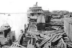 Shipping interests in Mobile Bay suffered extensively, with numerous vessels, including small boats, large yachts, schooners, and steamships, being sunk or driven aground.[7] Fifteen barges in the bay were destroyed and a similar number of sailing ships sank or sustained substantial damage.[17] In one case, a floating dry dock carrying a tugboat was deposited on the municipal docks.[28] Damage to ships was generally worsened by their owners' complacency stemming from the widespread belief that it was too early in the season for severe hurricanes.[7] In the southern part of the bay, several vessels foundered—among them the schooners Emma Lord and J. C. Smith and the barge Harry T. Morse—resulting in the deaths of about a dozen people.[7][29] Overall damage in Mobile was estimated at $2–3 million, and four drowning deaths were reported in and around the city. To the south, the storm produced severe property damage in Fort Morgan.[7]