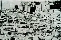 The Mobile waterfront was subjected to a storm surge of 11.6 ft (3.5 m), which still stands as the second-highest in the state's history, just short of the record set in Gulf Shores by the 1906 Mississippi hurricane, and the highest ever recorded at Mobile.[24] The tides severely flooded Mobile's business district up to four blocks inland, and it took until the late afternoon of July 6 for floodwaters to recede.[7] Some streets were submerged to a depth of up to 10 ft (3.0 m), and many residents fled to the Battle House Hotel on relatively higher ground.[25] Ultimately, waters still reached the hotel, flooding its lobby to a depth of just over 1 ft (30 cm).[26] In advance of the storm, most wholesale merchants stacked their goods above the high water mark of the 1906 hurricane, but this proved inadequate; tides locally ran nearly 2 ft (60 cm) higher than in 1906, ruining merchandise closest to the ground at a cost of around $500,000.[7] Many miles of railroads were covered by floodwaters and debris,[23] and the tidal action ravaged wharves.[7] At a Mobile and Ohio Railroad cargo storage shed, approximately 11,000 bales of cotton were washed away.[27]