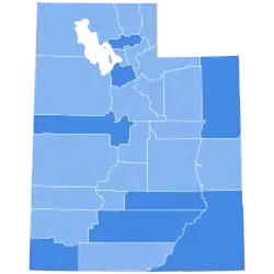 The combined result was that Wilson was able to make Utah his second-strongest victory outside of the "Solid South" – in a state that four years previously had given him his seventh-lowest popular vote proportion.[3] Utah was his eleventh-best state overall and voted 17.83 percentage points more Democratic than the nation at-large. Wilson swept every county in the state, including rock-ribbed Republican Kane County, which had been Taft's third-strongest county nationwide in 1912,[4] which has never otherwise supported a Democrat for president,[2] and where otherwise only William Jennings Bryan in 1896 and Franklin D. Roosevelt in 1936 have as Democrats received so much as one-third of the vote. This is the only time a Democrat swept every county in the state.