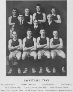 Freshman forward Bill Dudack later served as the Hoyas' head coach during the 1929–30 season.[1] Sophomore guard Alexander "Pat" Finnegan left school after the season for United States Army service in World War I and while in military service died of influenza — the so-called "Spanish flu" — during the 1918–1919 influenza pandemic.[11][12]