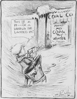 The strike wave had roots in a heating crisis that occurred in the city in late 1917. The early winter months of 1918 especially were characterized by a particularly severe coal shortage across the country as a result of World War I fuel rationing.[44][45][46] New York City was hit the hardest by the shortage because of its lack of long-term local coal stockpiles.[47] This was worsened further by the abnormally cold winter in New York City that year. The lack of coal would become one of the main motives for the early rent strikes because landlords stopped providing heating.[46]
