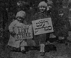 An April 9 article in the New York Evening Call describes some of the tactics used during a rent strike in Brownsville. During the strike, one tenement house in the neighborhood sat entirely empty after every tenant had been evicted; meanwhile, courthouses remained crowded with large groups of women holding each of their eviction notices. Entire neighborhood blocks were organized and picketed, filled with a procession of women wheeling baby carriages back and forth in front of struck apartments. Sympathy rent strikes were also a prevalent tactic.[81][82] While sweeping evictions had been a successful strategy for landlords in breaking the 1907 New York City Rent Strike, this tactic proved ineffective in breaking the 1918–1920 strike.[81][77] After school, the children of striking families would parade through the neighborhood to gain support from other tenants, singing songs with the following chorus:[82]