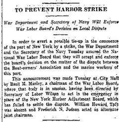- ^ "HARBOR WORKERS RENEW STRIKE TALK; May Insist on 25 Per Cent. Increase in Pay Refused by War Labor Board. EIGHT-HOUR DAY GRANTED Refer Question to Six Unions of Affiliation for Decision, and May Tie Up Port Again. Expects Large Overtime Wages. HARBOR WORKERS RENEW STRIKE TALK No Change in Garment Strike" (PDF). The New York Times. February 27, 1919. ISSN 0362-4331. Archived from the original on May 30, 2023. Retrieved March 6, 2023.