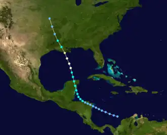 An area of disturbed weather developed into a tropical depression northwest of Colombia on September 16. The system remained a weak tropical depression as it made landfall on Nicaragua, but later intensified to tropical storm strength as it moved across the Gulf of Honduras, prior to making a second landfall on the Yucatán Peninsula. Once in the Gulf of Mexico, the storm quickly intensified as it moved towards the north-northwest, reaching its peak intensity as a Category 2 hurricane with winds of 100 mph (160 km/h) prior to making landfall near Houma, Louisiana with no change in intensity. Afterwards, it quickly weakened over land, before dissipating on September 23 over eastern Kansas.[4]