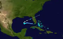A low-pressure area centered the Gulf of Mexico on September 25 and was designated as a tropical depression hours later.[8] Turning west-southwestward, the storm gradually intensified, attaining tropical storm-status on September 27. The next day, the system nearly stalled close to the center of the Gulf of Mexico.[4] On September 28, further development of the storm took place and ships in the vicinity of the storm reported a strong gale.[8] The next day, the storm strengthened into a hurricane.[4] Several hours later, nearby ship reported a pressure of 987 mbar (29.1 inHg), the lowest pressure associated with the hurricane.[13] Around this time, the storm reached its peak intensity with winds of 85 mph (137 km/h); the storm also began to turn northeastward at this time. The hurricane then accelerated and began weakening. Early on September 30, the storm made landfall near Cedar Key, Florida, with winds up to 65 mph (105 km/h) before transitioning into an extratropical cyclone over Florida. Later that day, the remnants dissipated over the eastern Atlantic Ocean.[4]