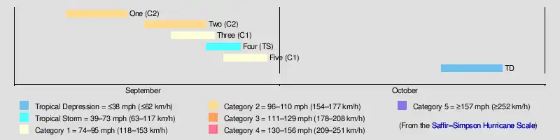 Of the season's six tropical cyclones, five became tropical storms and four strengthened into hurricanes. Furthermore, none of these strengthened into a major hurricane—Category 3 or higher on the modern-day Saffir–Simpson hurricane wind scale—marking the seventh such occurrence since 1900.[2] The strongest hurricane of the season peaked as only as a strong Category 2 with winds of 110 mph (180 km/h). The second hurricane caused one death and $1.45 million (1920 USD) in damage in Louisiana, the third left one fatality in North Carolina, and the fifth storm indirectly killed one person in Florida.