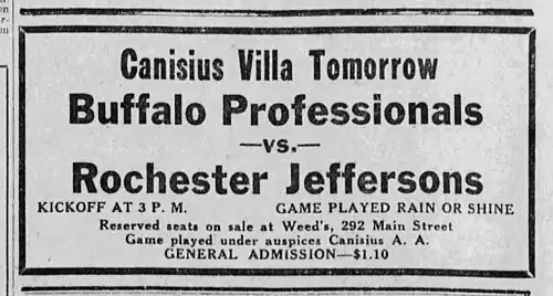 - ^ "Smoother Teamwork Enables Crack Buffalo Professional Eleven to Beat Jeffs, 17–6," Rochester Democrat and Chronicle, Nov. 1, 1920, p. 23.