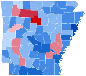 Despite this, the solid Democratic majority of Arkansas was always conceded by polls across the nation at the end of October, even as the possibility of Harding breaking the “Solid South” was seen in Tennessee and even North Carolina.[12] In culmination, Cox won the election in Arkansas with 58.05 percent of the vote; Harding received 39.15 percent of the vote and the only other candidate on the ballot, imprisoned Socialist Eugene Debs received the remaining 2.80 percent. Harding's result was nonetheless a major improvement upon the mere 28 percent won by Charles Evans Hughes in 1916, and rivaled any Republican performance in the state since the advent of the poll tax, although Theodore Roosevelt in 1904 had done marginally better. Harding was the first Republican to ever carry Van Buren County,[13] the first to carry Logan County since Ulysses S. Grant in 1872,[13] and the first Republican since Benjamin Harrison to carry Arkansas County and Lincoln County.[13]