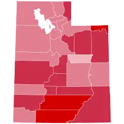 All these factors combined to produce a national landslide, with a swing of almost twenty-nine percentage points to the Republicans vis-à-vis the election of 1916. Utah followed the national trend closely: whereas Wilson had won the state by twenty percentage points in 1916 and had clean-swept the twenty-eight extant counties, in 1920 Harding by campaigning on a "return to normalcy" carried every county in Utah with a swing of thirty-seven percentage points. This was the first time Washington County had ever been carried by the Republican nominee.[5] Despite this large swing, Utah in 1920 still voted 9.08 percentage points more Democratic than the nation at-large.[6]