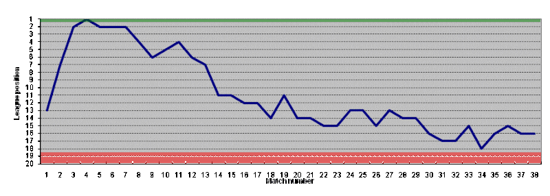 The chart below shows Nelson's league positions throughout the course of the 1921–22 season. The green area (position 1) represents the automatic promotion place to the Football League Second Division, while the red area (positions 19 and 20) shows the teams who had to apply for re-election to the League at the end of the season. The highest position achieved by Nelson during the season was 1st place, after the fourth match. In the middle of the season Nelson slipped down the league table, eventually finishing in 16th position.