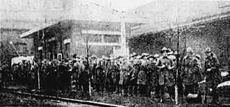 In the drizzling rain they marched to the mill,[e] men and children of the town jeered and cursed at them.[24][28] While marching into the plant several shots fired out. In response troops stopped and set up a machine gun. After ten minutes of quiet, the gun was dismantled and taken into the plant.[24]