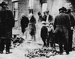 That night, machine guns at the Rolling Mill were fired into homes, from 11pm to 4am.[70][3] Accounts by citizens and Sheriff Tieman mention mill guards doing so unprovoked.[3] Any who attempted to leave their homes were reportedly shot at.[3] Many citizens fled to their cellars or behind makeshift barricades for safety.[70][3] Citizens estimated more than 1,000 bullets were shot.[70] The company denied any shots were fired by guards except two at a man who came inside the mill enclosure.[70] Many homes ended being severely damaged, which one reporter upon seeing them described as "shot to pieces".[3]