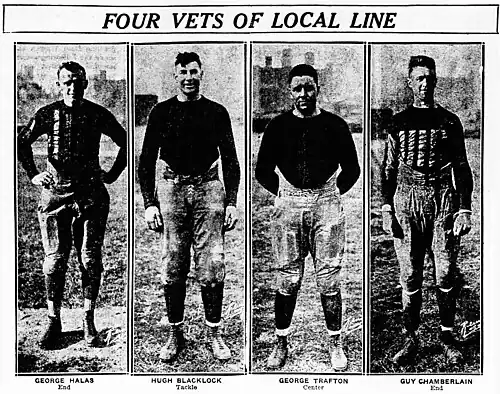 The speedy Sternaman remained the team's biggest star in 1921, but he was joined by others, including newcomers Gaylord Stinchcomb, who became the starting quarterback, and three-time All-American Chic Harley, who took over at right half.[4] The line was tough and experienced, anchored by ends Halas and Guy Chamberlain, center George Trafton, and right tackle Hugh Blacklock.[4]