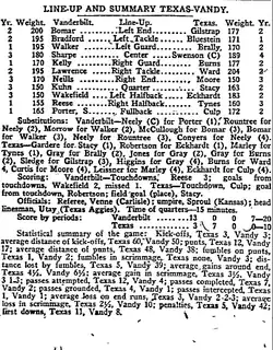 The starting lineup was: McCullough (left end), Bomar (left tackle), Morrow (left guard), Sharp (center), Kelly (right guard), Lawrence (right tackle), Neil (right end), Kuhn (quarterback), Wakefield (left halfback), Neely (right halfback), and Porter (fullback).[36]