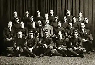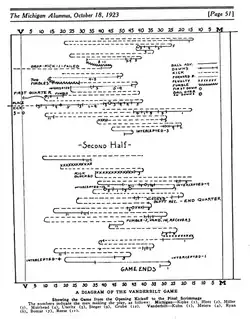 On October 13, 1923, Michigan defeated the Southern Conference co-champion Vanderbilt Commodores, 3–0, at Ferry Field.[10][11] Michigan's victory snapped a 20-game unbeaten streak for Vanderbilt that dated back to November 1920.[12] Vanderbilt was coached by Dan McGugin, who had played for Yost's Michigan teams in 1901 and 1902 and had been an assistant coach for Michigan in 1903. During McGugin's tenure at Vanderbilt, Michigan played nine games against the Commodores from 1905 to 1923, with Michigan winning eight games and playing to a tie in 1922.[13] Vanderbilt returned nine of eleven starters from its 1922 team that held Michigan scoreless in the prior year's game and was regarded as having as strong a team as it had in 1922.[10][14][15]