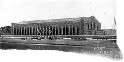In May 1923, the University of Michigan's Board of Control of Athletics announced that the new field house under construction would be named after Fielding H. Yost, who had been Michigan's head football coach for 22 years.[4] At the time of its completion in the fall of 1923, Yost Field House was "the largest structure for competitive athletics in the world."[5] The structure was designed to have a seating capacity of 12,500, an indoor track with a 75-foot straightaway, basketball courts, indoor practice facilities for the football and baseball teams, locker and shower facilities for 4,200, athletic association offices, and trophy rooms.[4]