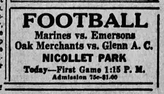 - ^ "Marines Nose Out Emersons by 7–2 Score: North Side Team Gives League Team Scars in 1st, 4th Quarters," Minneapolis Tribune, Nov. 19, 1923, p. 8.