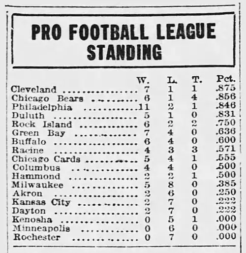 - ^ "Cleveland Bulldogs Jerk Game From Fire," Akron Beacon Journal, Oct. 6, 1924, p. 16.