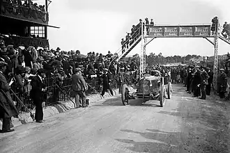 The second San Sebastián Grand Prix got a strong international field with Bugatti, Delage and Rolland-Pilain from France. They were up against Sunbeam, Mercedes and Diatto from Italy. In the absence of Alfa Romeo, French hopes were high for victory, but once again they were thwarted, this time by Sunbeam. At the start it was Masetti in the Mercedes who led until he retired with engine problems. Segrave narrowly won from Costantini's Bugatti and André Morel in a Delage.[8] There were several crashes in the race, but the most serious incident was with the Sunbeam of Kenelm Lee Guinness. On lap 11 he hit a rut in a corner that threw him into the roadside banking which then rolled the car three times on the wet track. His mechanic, Tom Barrett, was killed instantly and Guinness suffered severe head and arm injuries that curtailed his racing career.[32] The race was also significant for being where Segrave pioneered the wearing of a crash helmet in racing.[33]