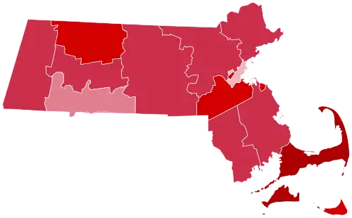 Coolidge swept every county in the state of Massachusetts, and his 65.34% of the popular vote would prove to be his fifth strongest state in the 1924 election in terms of popular vote percentage after neighboring Vermont, Michigan, Maine and Pennsylvania.[3] To date, this is the last time a Republican presidential candidate has carried every county in Massachusetts as well as the last election in which a Republican presidential candidate has won Suffolk County, home to the state's capital and largest city, Boston. No Republican has reached 60% of the vote since.[4] It is also the last time that the towns of Hadley and Hatfield and the cities of Boston, Cambridge, Chelsea, Chicopee, Lawrence, and Revere voted Republican. From his time as governor, Coolidge remained relatively popular, for a Republican, among Irish Catholics and the other ethnic immigrant groups who populated Boston. Many of these voters would defect to the Democrats for Catholic Al Smith in 1928 and become reliable Democratic voters after that, making Boston a reliably Democratic city in every election that followed.