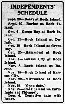 - ^ "Bears Hold Rock Island to Scoreless Tie: Fumble Ruins Independents' Chances When Ball Rests On One-Yard Line," Rock Island Argus, Sept. 21, 1925, p. 12.