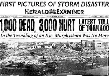 1. ^ "1925 — March 18, Tornadoes, esp. Tri-State Tornado (IL/IN/MO) 695; AL/KY/TN–740-792 – Deadliest American Disasters and Large-Loss-of-Life Events". usdeadlyevents.com. March 18, 1925. Retrieved July 8, 2025.