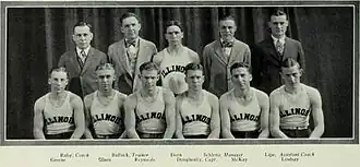 Craig Ruby entered his fifth season as head coach of the Fighting Illini. This team returned only five letterman from a team that placed in a tie for fifth place in the Big Ten a year earlier. Slightly improved, the team finished with an overall record of 10 wins and 7 losses. In the conference they finished with 7 wins and 5 losses. The starting lineup included captain Russell Daugherity at forward, Ernest Dorn and Robert Greene rotating at the other forward slot, Robert McKay and K.L. Reynolds at guard, and F.H. Lindsay at center.[1]