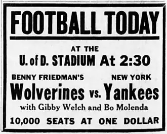 Yankee Stadium was the scene and 2:30 pm was the time for the October 14 franchise debut of the Detroit Wolverines as they faced C. C. Pyle's New York Yankees.[29] Gibby Welch, "Wild Bill" Kelly, and Bo Molenda were among those Yankees receiving top billing in the battle against former University of Michigan star Benny Friedman.[29] An impressive crowd of 18,000 made their way to the stadium, joined by a region radio audience listening to the live sideline broadcasts of two competing stations.[29]