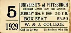 Pitt and Carnegie Tech shared the use of Pitt Stadium from the 1929 season through the 1943 season. For $18.00 one could purchase a season ticket for all nine games scheduled at the stadium.[23][24]