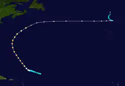 The first hurricane of the season was first noted in the central Atlantic Ocean on August 21. Slowly intensifying, the system initially moved towards the west.[2] On August 22, a steamship in the vicinity sustained some structural damage.[4] After attaining hurricane strength on August 24, the system turned northwestward, and reached Category 3 intensity on August 25 with maximum sustained winds of 125 mph (205 km/h) as it grazed Bermuda.[2] Recurving to the northeast, the French transatlantic ocean liner SS Paris encountered the hurricane while it was a Category 2 hurricane. A large wave struck the ship, shattering glass on the vessel and injuring 40 passengers.[5][4] Although still a Category 2 hurricane, the system became extratropical shortly after on August 28.[2] The extratropical storm was tracked due east towards the Azores for a few days while gradually weakening before abruptly turning to the north and dissipating.[4]