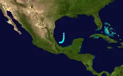 The final storm of the season developed in the Bay of Campeche on October 18 at the tail end of a frontal boundary. Although cool-air advection was occurring off the United States coast, warm air around the system allowed the tropical storm to intensify. Moving to the northeast, the system reached peak intensity as a high-end tropical storm with winds of 70 mph (110 km/h). Ultimately, the cool-air advection eventually took a toll on the storm, causing it to quickly weaken. By 06:00 UTC on October 21, the storm dissipated.[12]