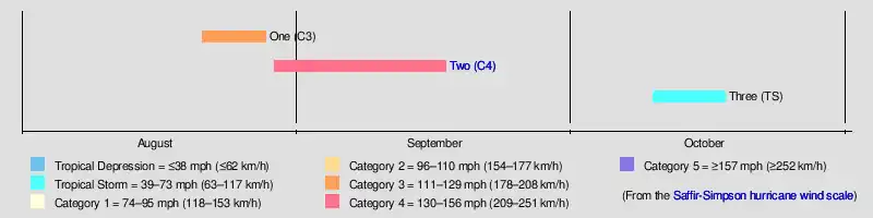 The 1930 Atlantic hurricane season was a very inactive Atlantic hurricane season. It was the second least active on record in terms of tropical storms forming, only behind 1914, with only three systems reaching tropical storm intensity. Of those three, two reached hurricane status, both of which also became major hurricanes, Category 3 or higher storms on the Saffir–Simpson hurricane wind scale.[1] The first system developed in the central Atlantic Ocean on August 21. Later that month, a second storm, the Dominican Republic hurricane, formed on August 29. It peaked as a Category 4 hurricane with winds of 155 mph (250 km/h). The third and final storm dissipated on October 21.
