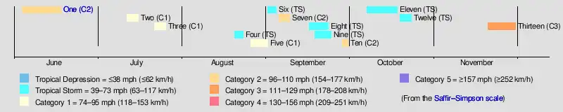 One | June 4 – 18 | Category 2 hurricane | 100 (160) | 966 | Central America, Eastern United States, Eastern Canada | $4.4 million | 1,000–3,000 | |||