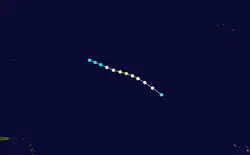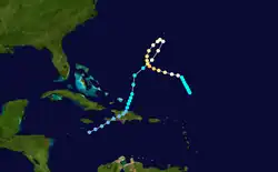 A tropical storm was first documented east of Barbados around 12:00 UTC on September 16. It alternated between a west-northwest and west motion for several days, narrowly missing the Leeward Islands and gradually strengthening to a peak intensity of 50 mph (80 km/h). The system weakened to a tropical depression on September 21 and passed near the northern Bahamas before turning north and north-northeast. It dissipated after 12:00 UTC on September 23 off southeastern North Carolina while interacting with an approaching front.[5][6] The Lesser Antilles mainly recorded rainfall due to the storm, with Martinique observing up to 1.5 in (38 mm) at Ducos.[48]