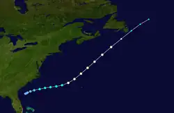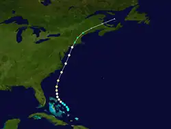 Although its origins are not conclusively known, a tropical storm is believed to have developed near the Bahamas around 06:00 UTC on September 5 from the remnants of a mid-level trough.[5] The cyclone began on a west-northwest trajectory but curved toward the north-northeast over subsequent days. It reached hurricane strength early on September 6 and further intensified to a Category 2 hurricane with winds of 105 mph (169 km/h) late the next day. The storm made close approaches to the coastlines of North Carolina and New Jersey before making later landfalls in New England. The first landfall occurred on Long Island with winds of 75 mph (121 km/h) at 02:00 UTC on September 9, and the second took place near New Haven, Connecticut, with winds of 60 mph (97 km/h) two hours later. The system transitioned into an extratropical cyclone by 06:00 UTC on September 9 and curved northeast before dissipating over the Gulf of Saint Lawrence the following morning.[6]